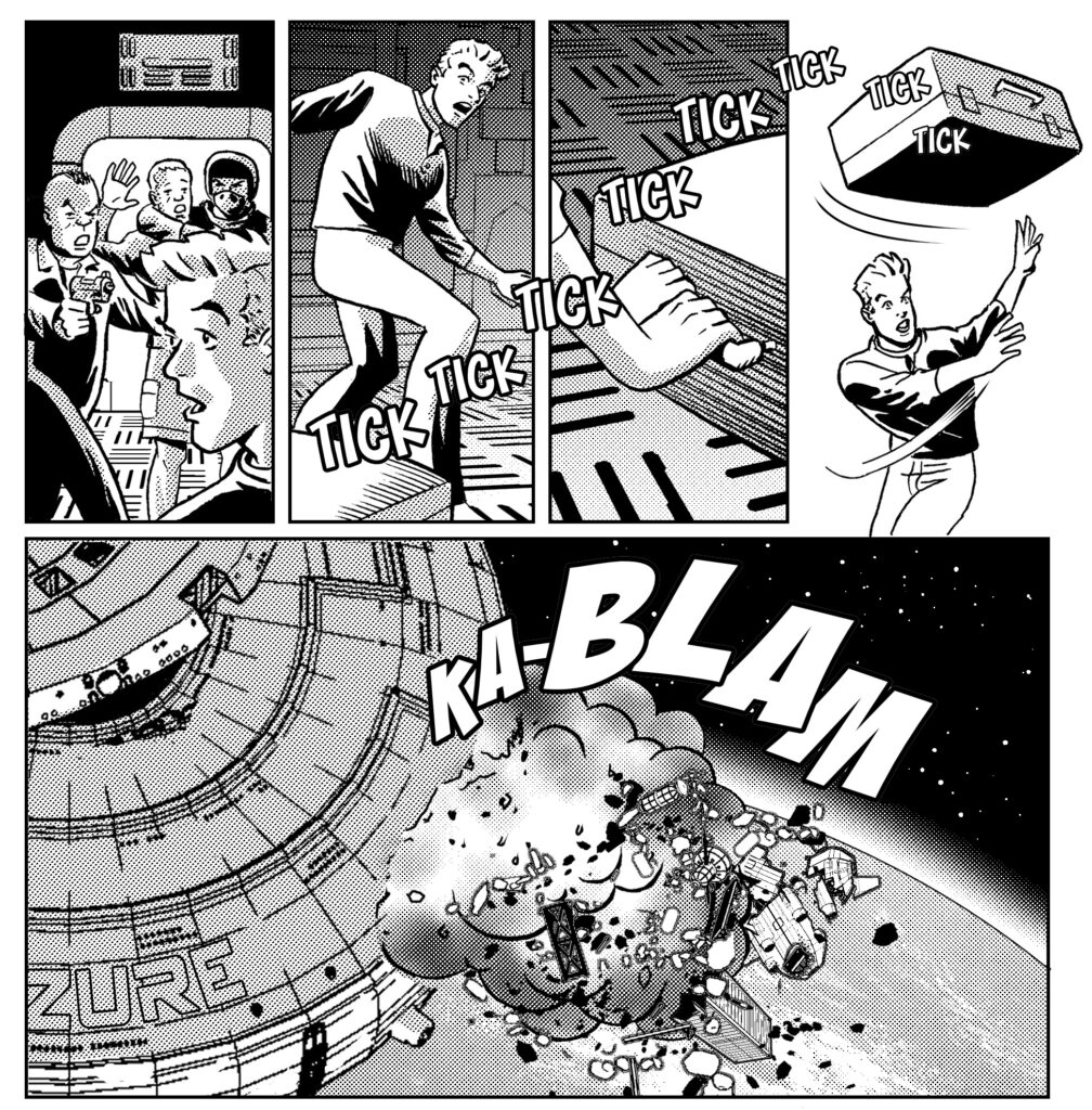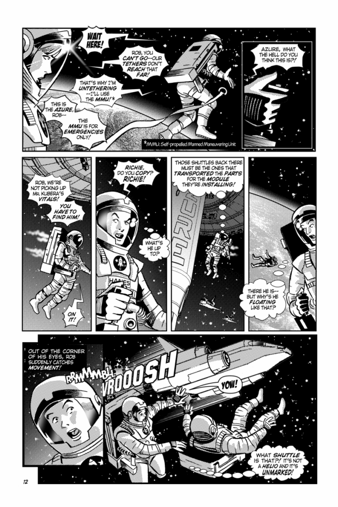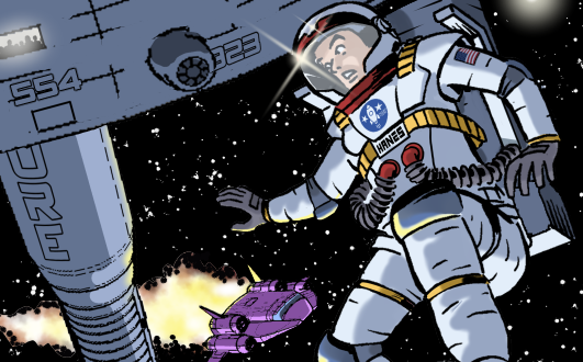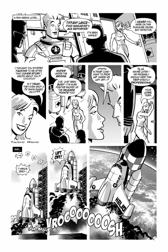 As announced earlier, Rob Hanes Adventures #26 represents a giant leap for the adventure series when the titular Justice International agent goes into space, shuttling to a space station under construction to investigate threats against the project. Like many stories in the series, the issue’s storyline is inspired by recent headlines, such as the current billionaire space race and recent crypto currency scandals. But, as always, these elements simply are a backdrop for a fast-paced and entertaining story full of action, adventure and fun.